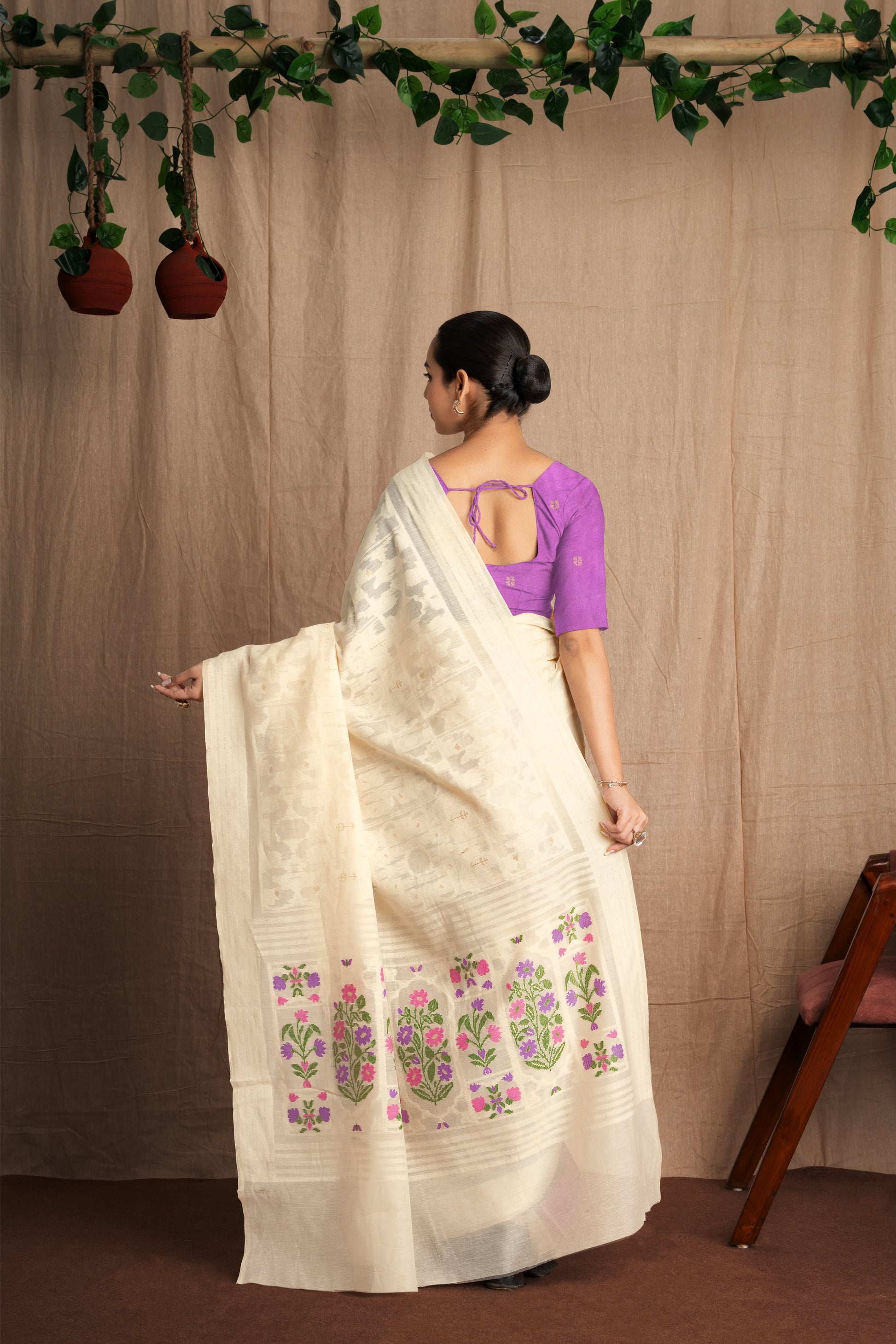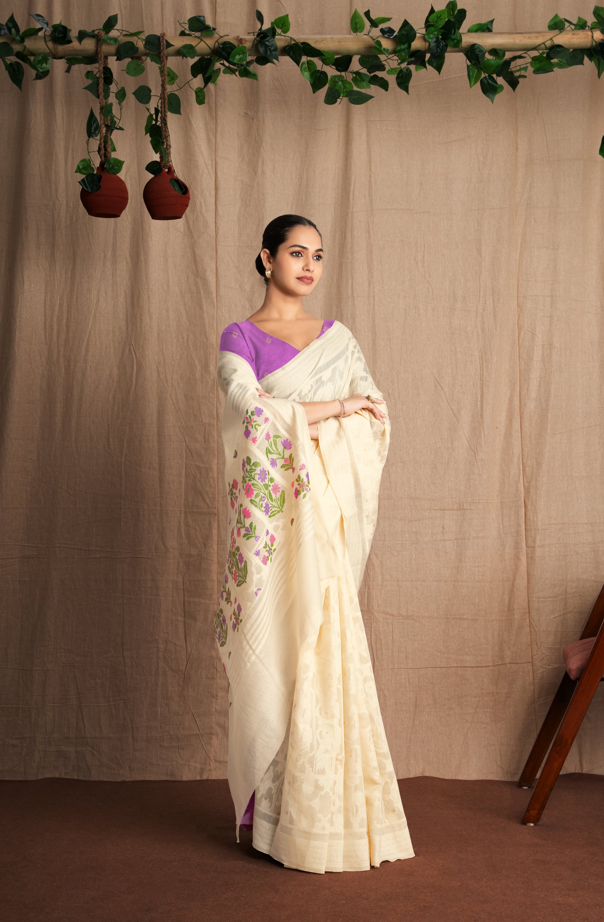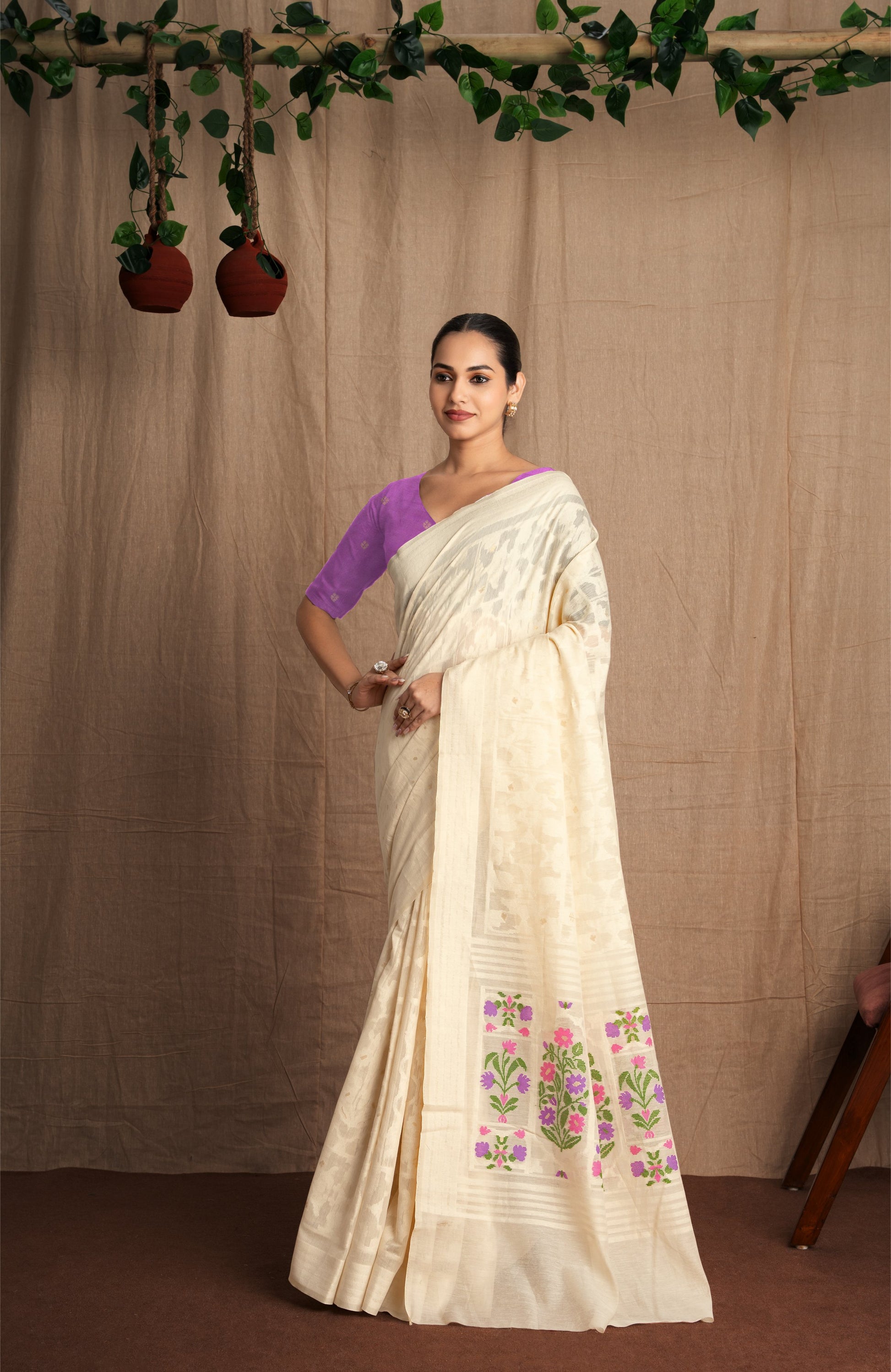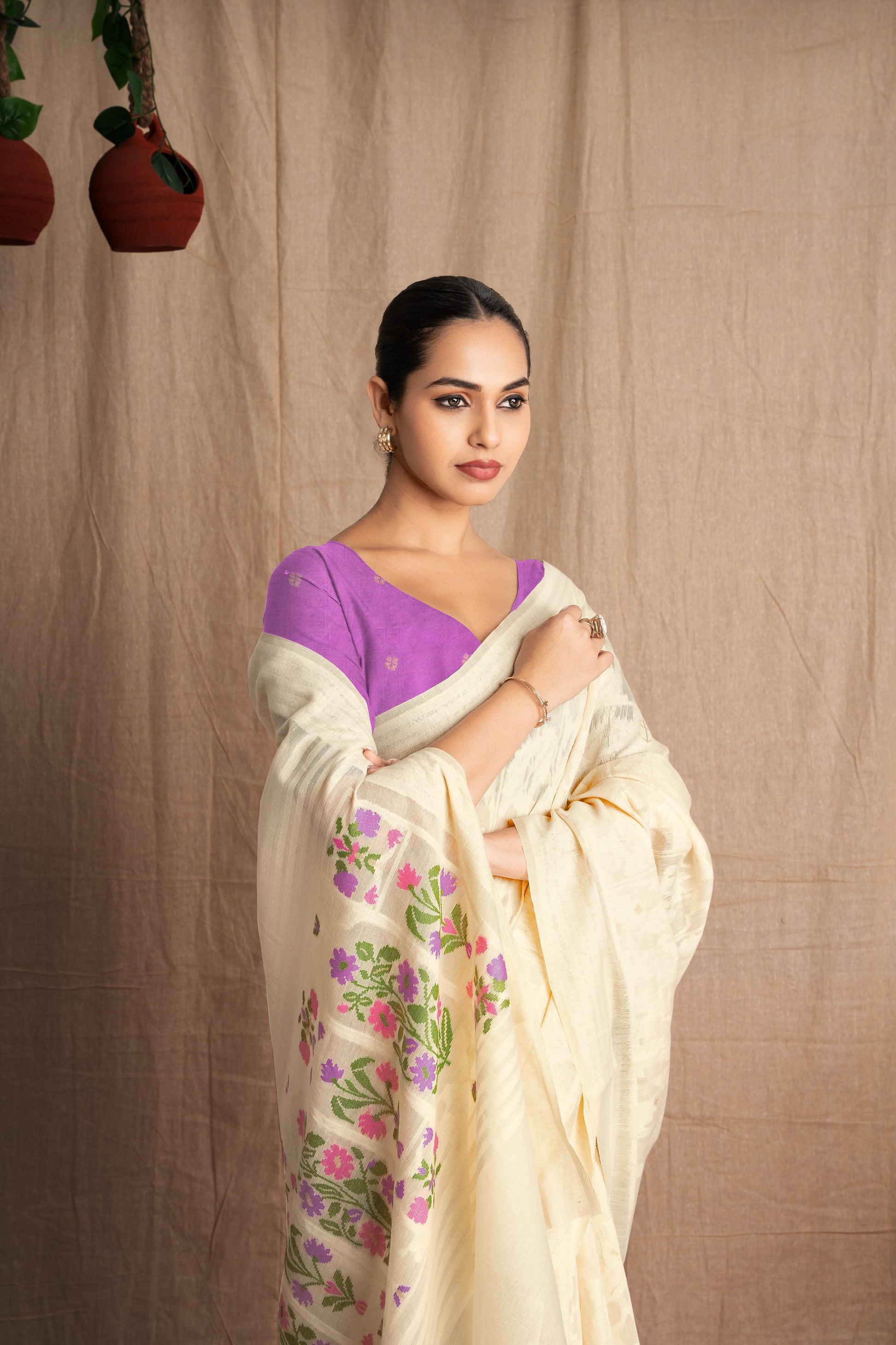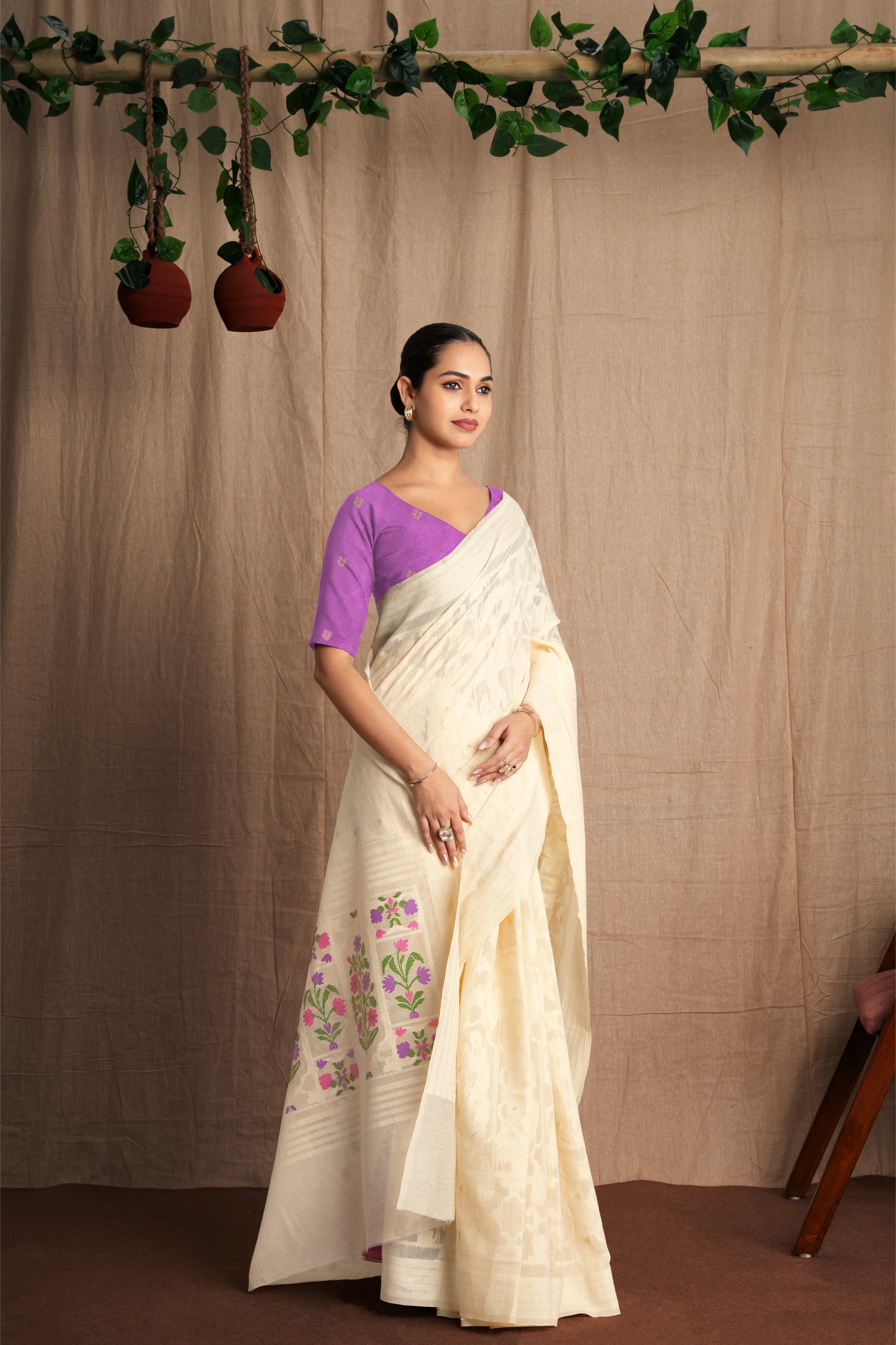 Navya | Pearl White + Purple Muga Cotton Jamdani Woven Saree.