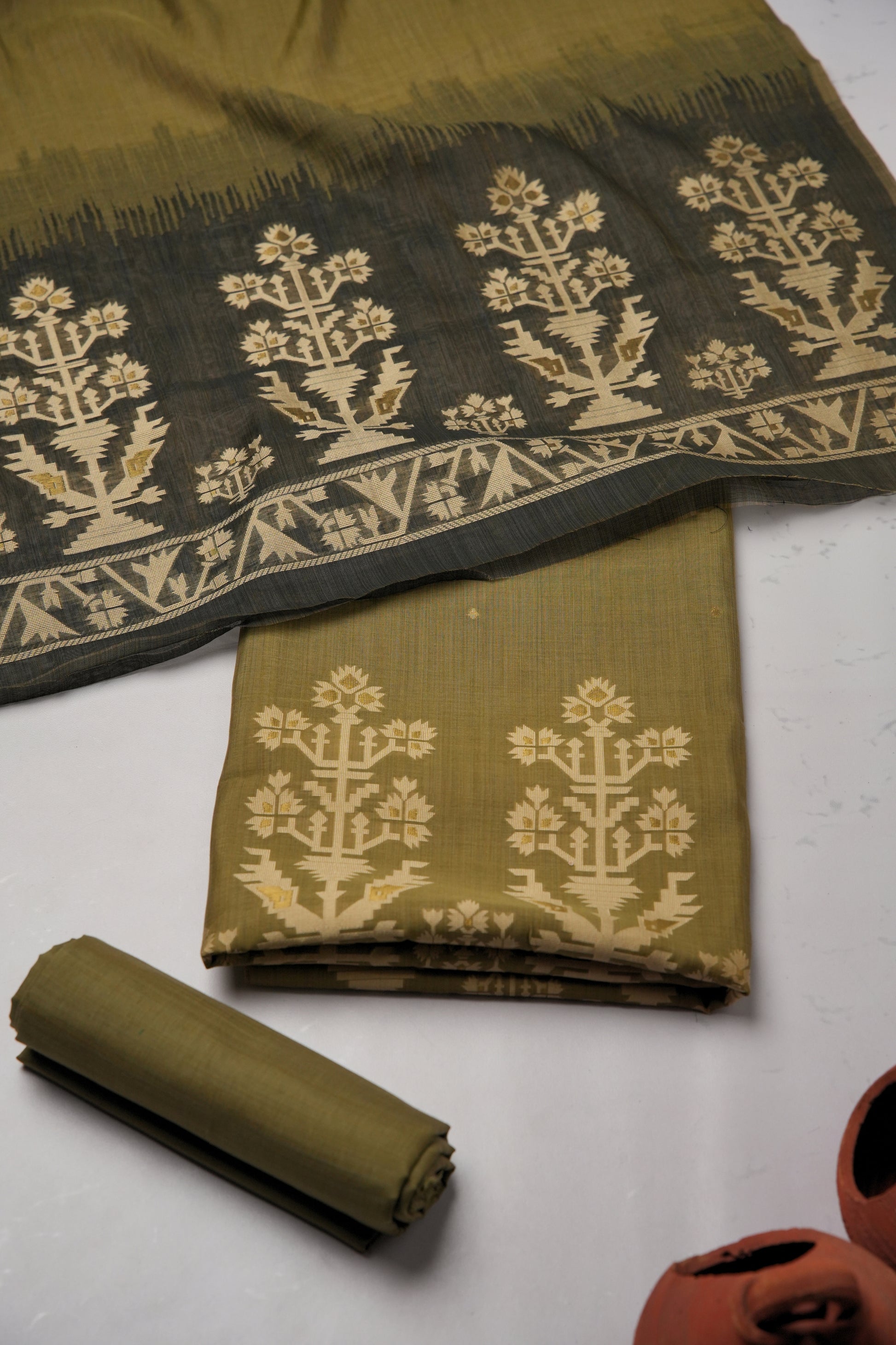 Arnika 3-Piece Viscose Jamdani Olive Green Suit Set