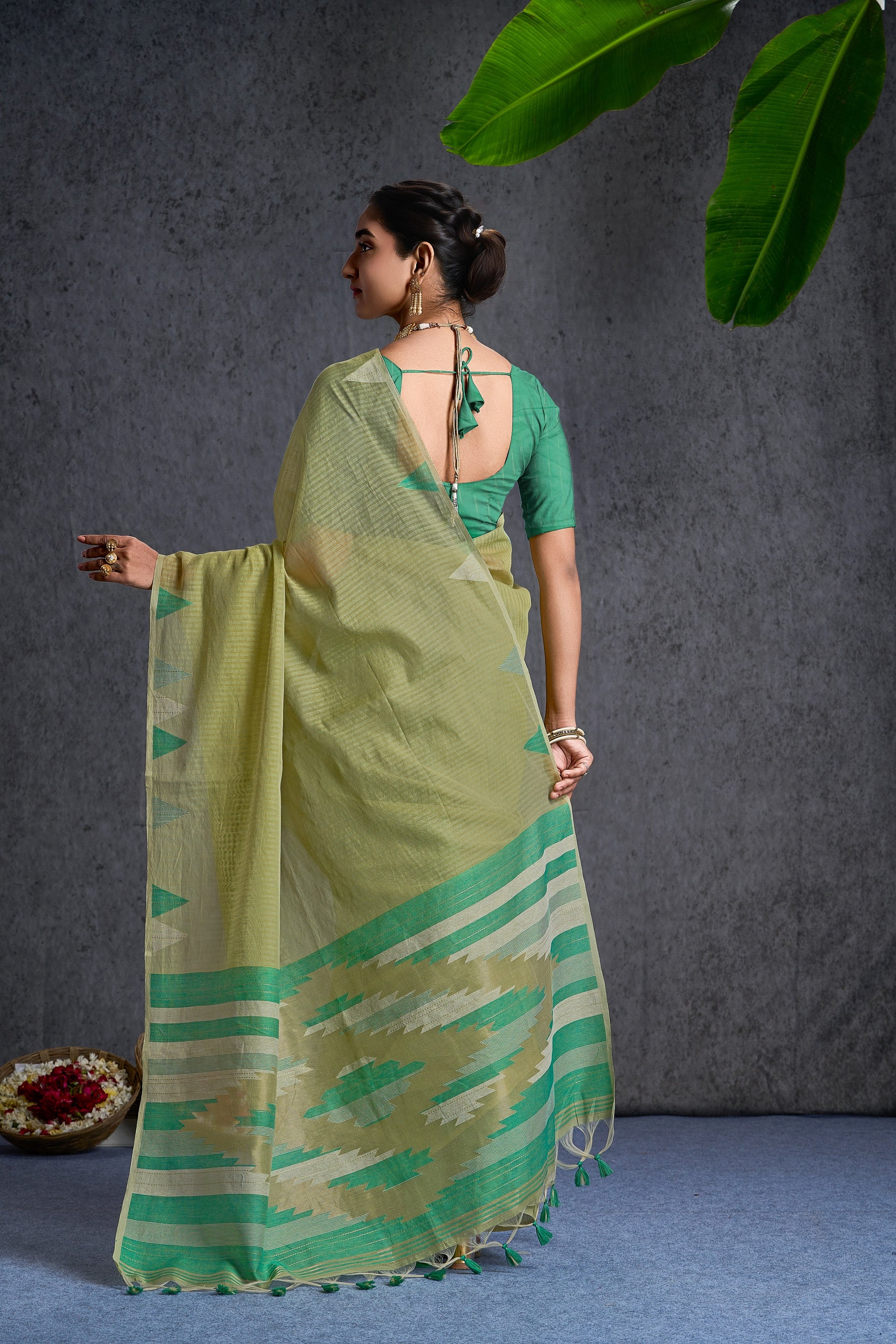 Dhakai Sparsh | Green Soft Cotton Mul Jamdani Design Jacquard Woven Saree.