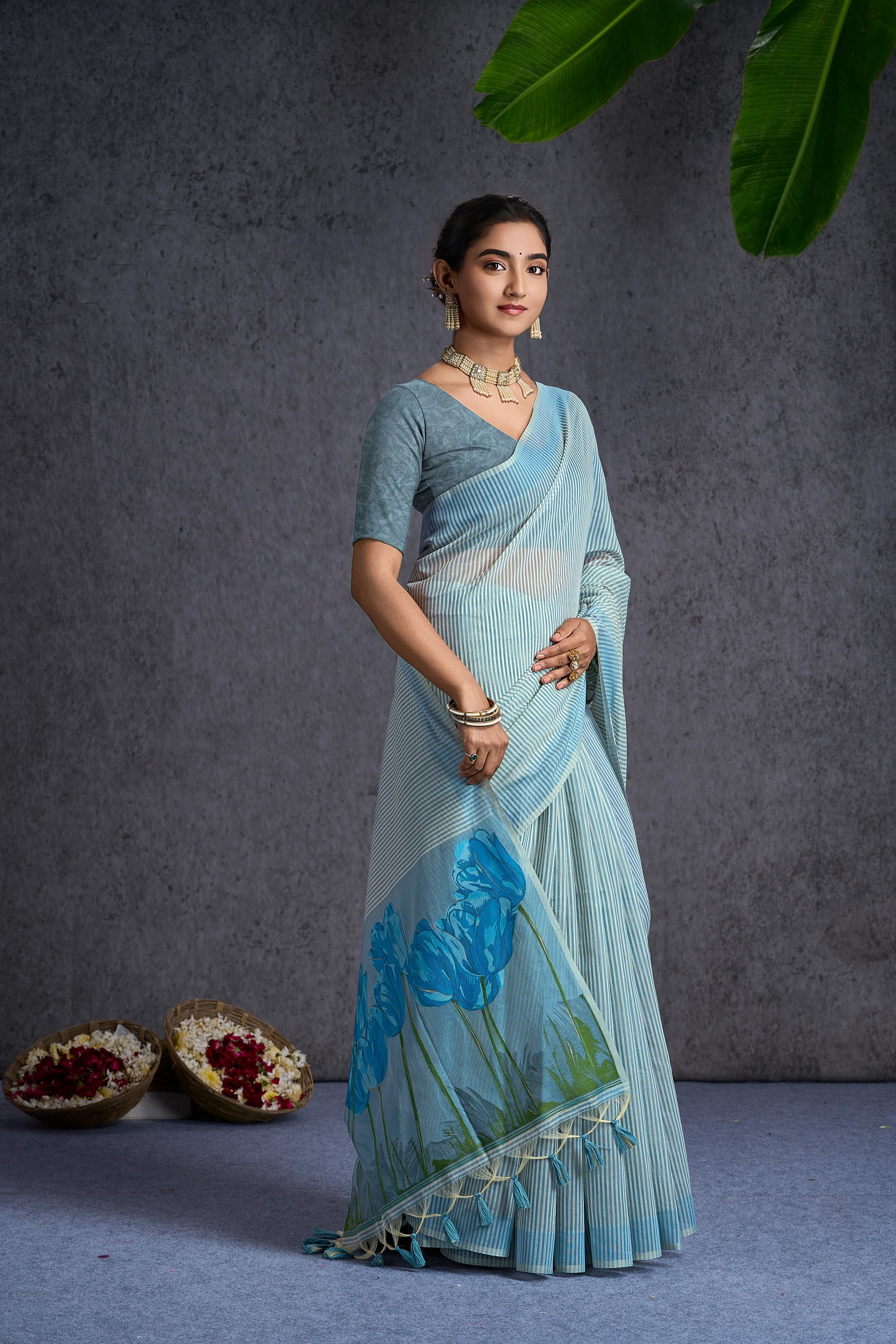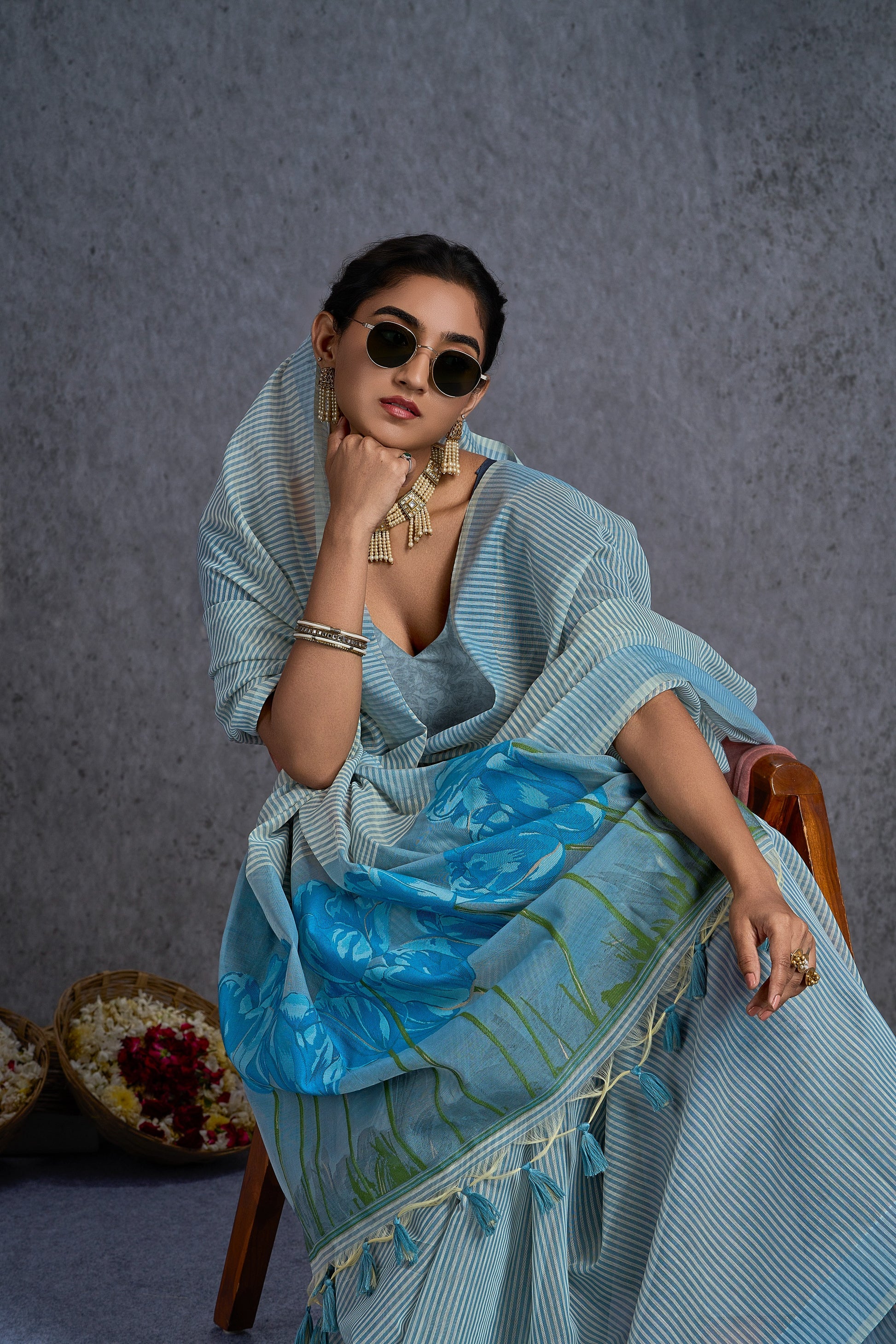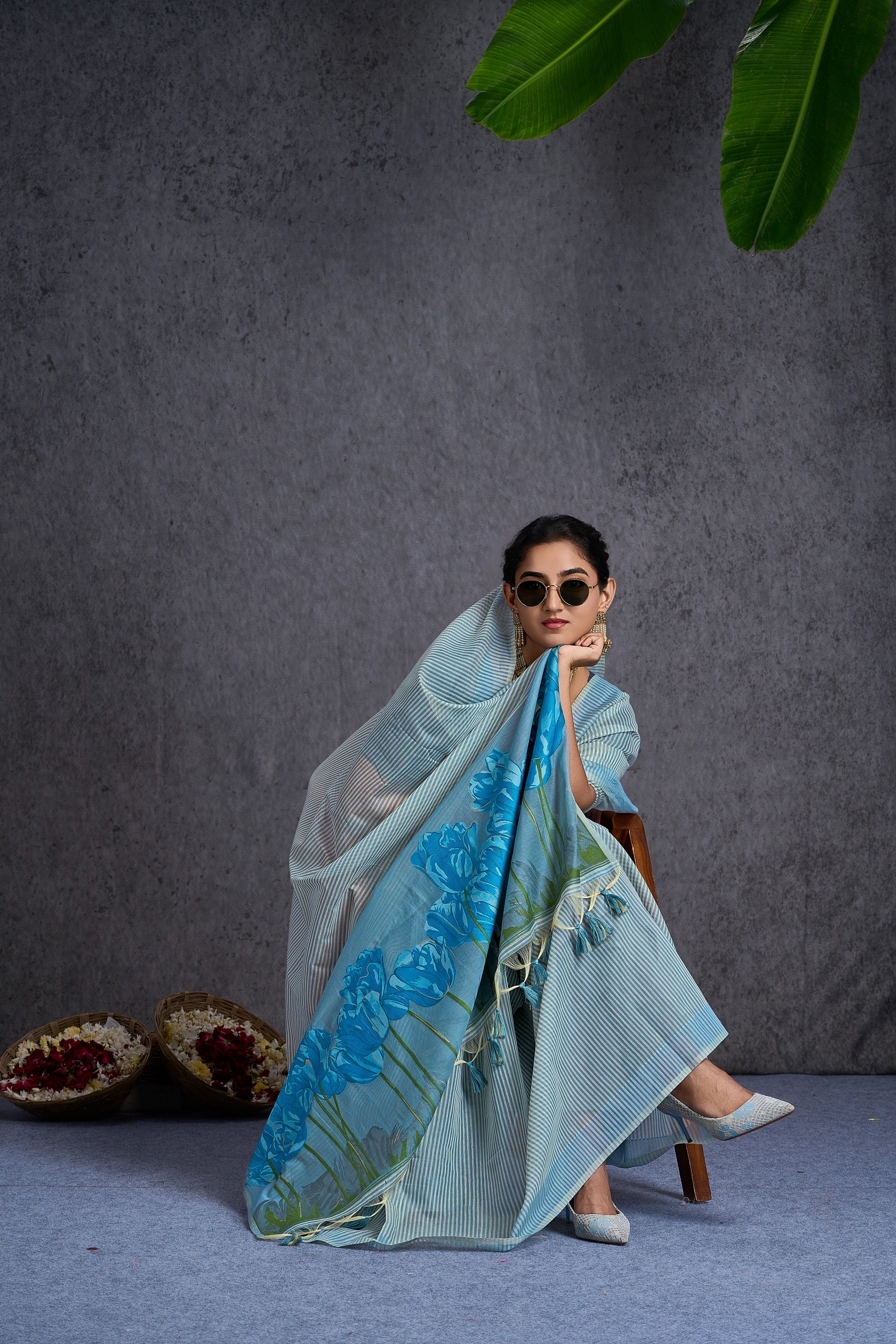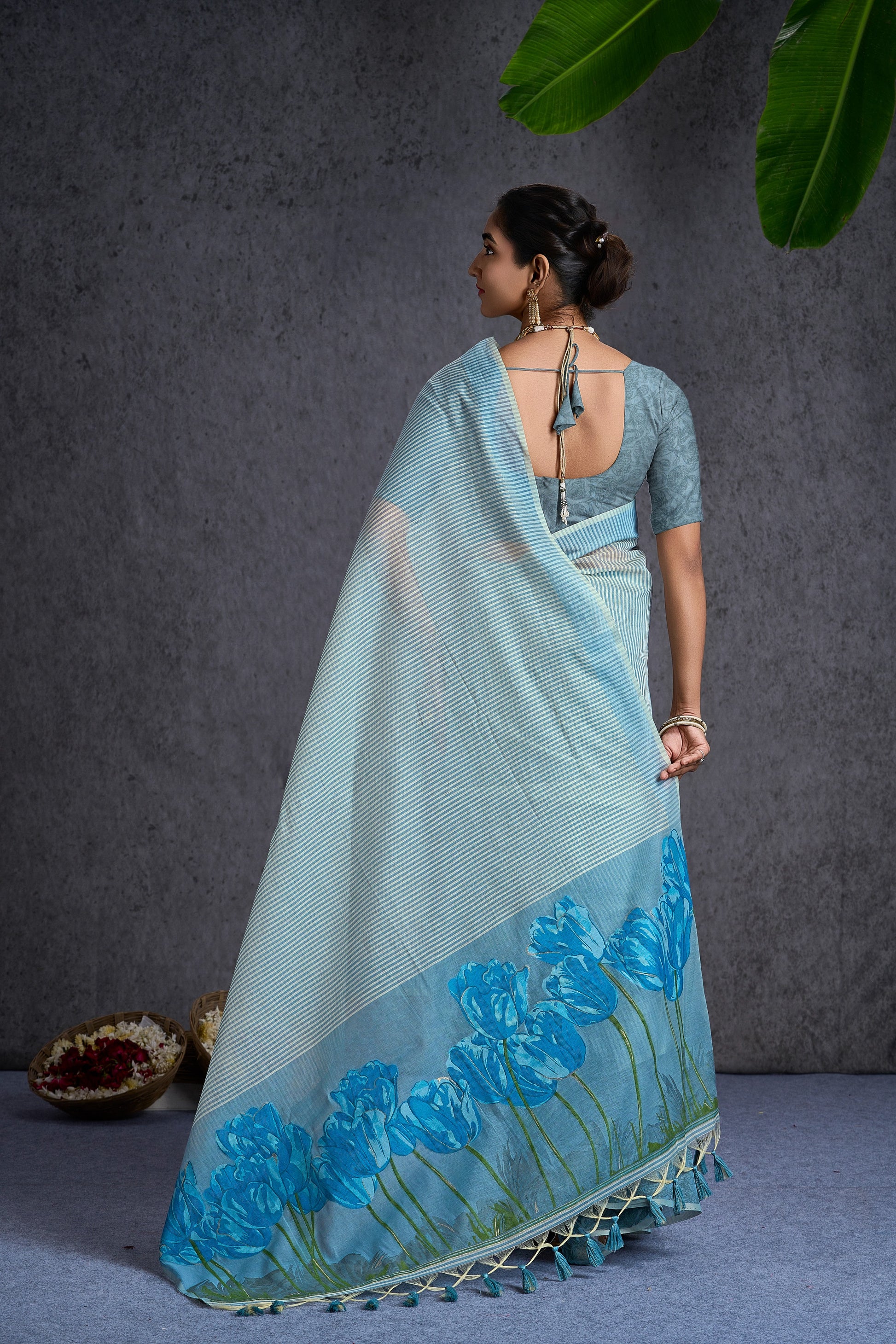 What truly elevates the design is the pallu, where a line of bold, artistic tulip motifs unfolds at the edge. The flowers are illustrated in a fluid style, adding a gentle contrast to the crispness of the striped body. The entire saree is crafted on a jacquard-woven base, giving the patterns a subtle texture and refined depth that feels elegant up close. The shading within each tulip adds a soft, almost hand-painted effect, creating a delicate play of light and depth, while still maintaining the precision of weaving. These tulips feel alive, bringing a quiet vibrancy to the drape and turning the pallu into a graceful statement that draws the eye without overwhelming the saree’s overall minimal charm.