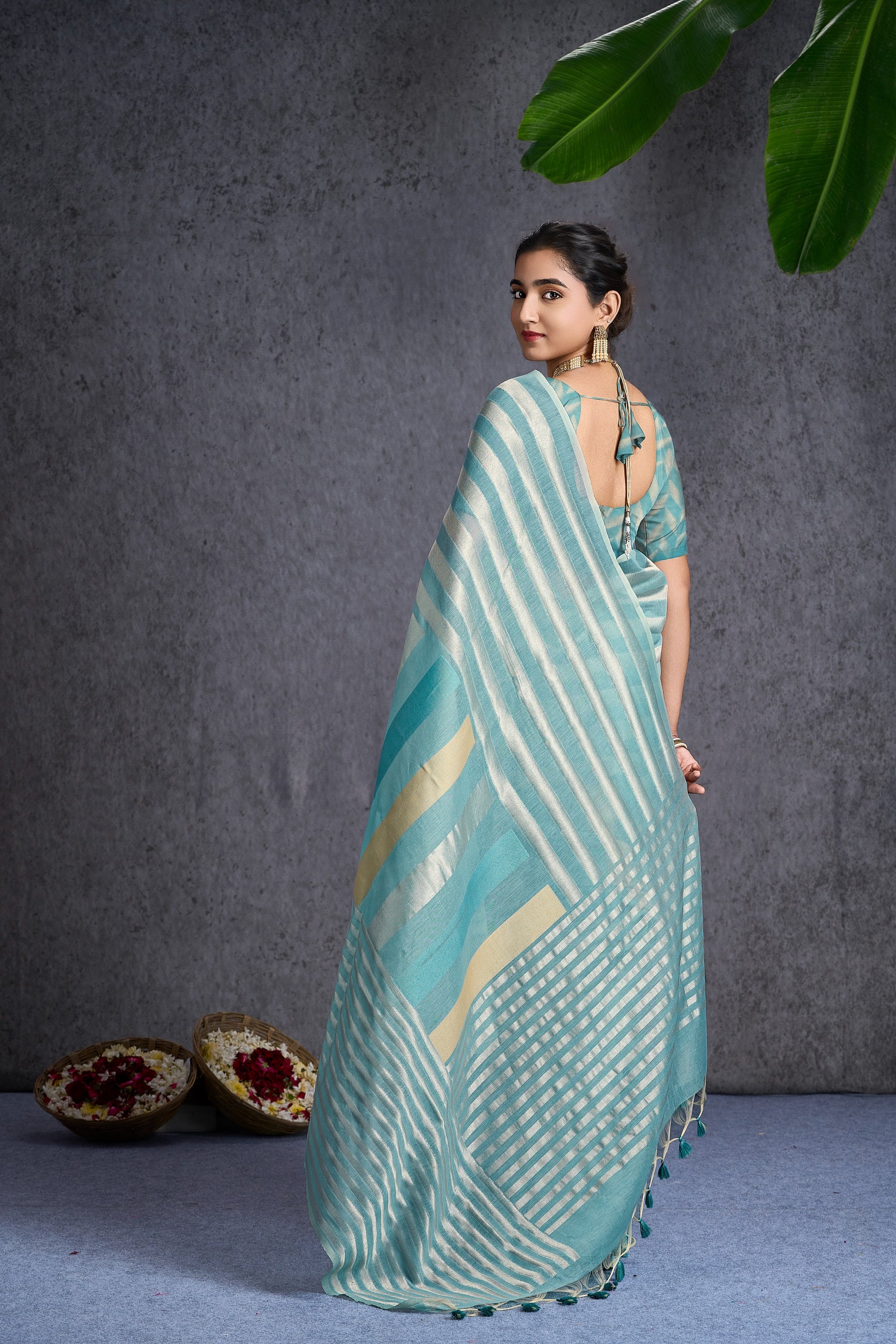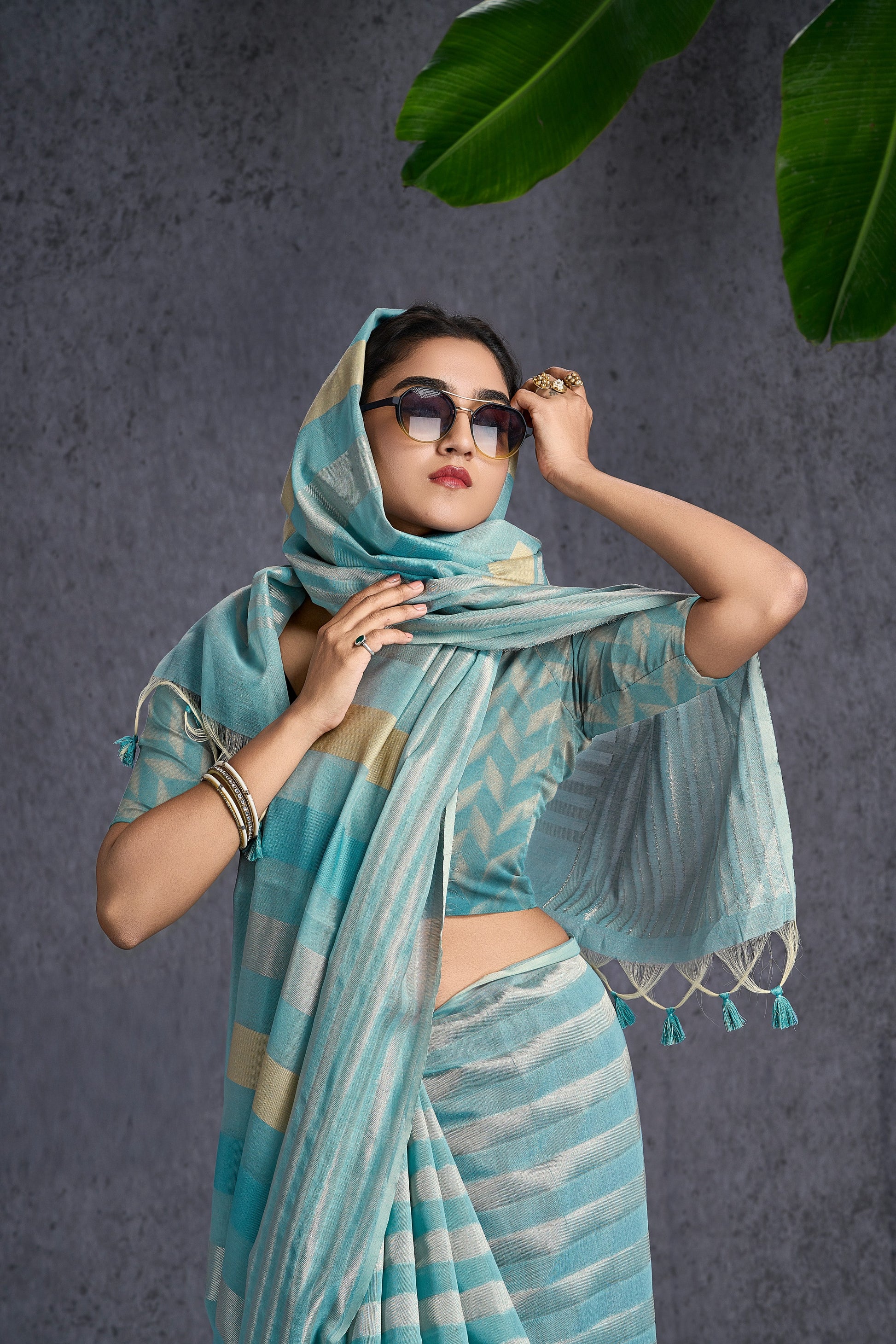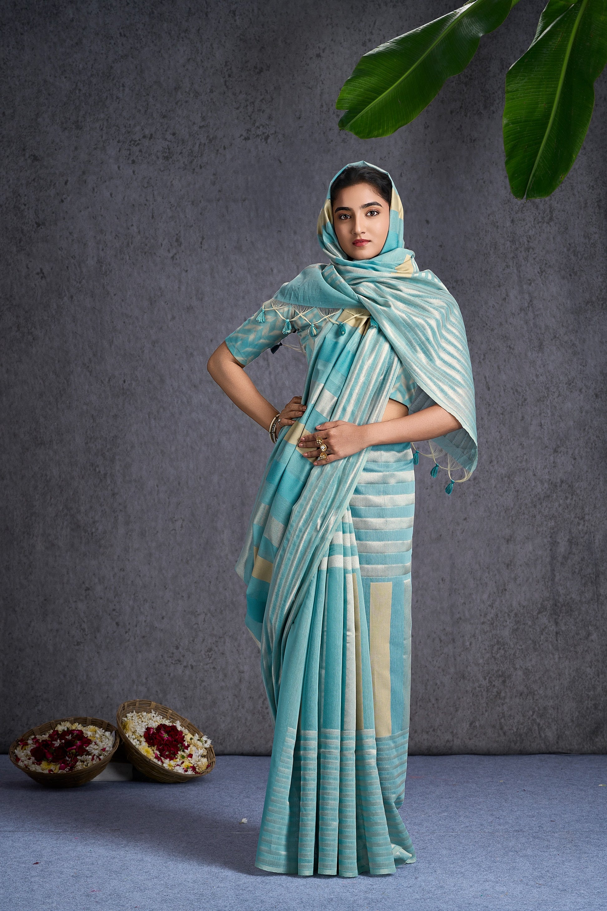 Swarni | Baby Blue Cotton Blend Geometric Design Jacquard Woven Saree.
