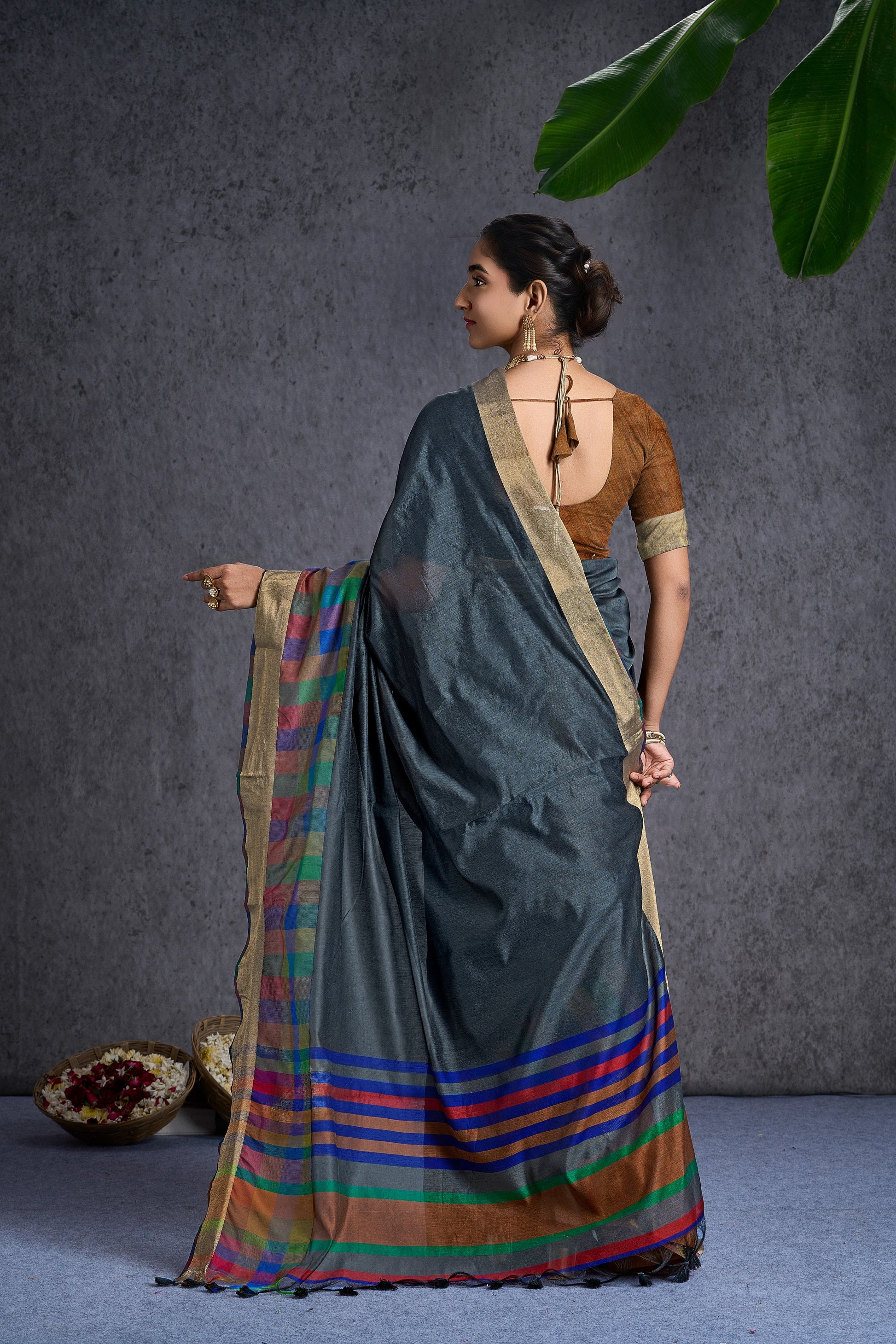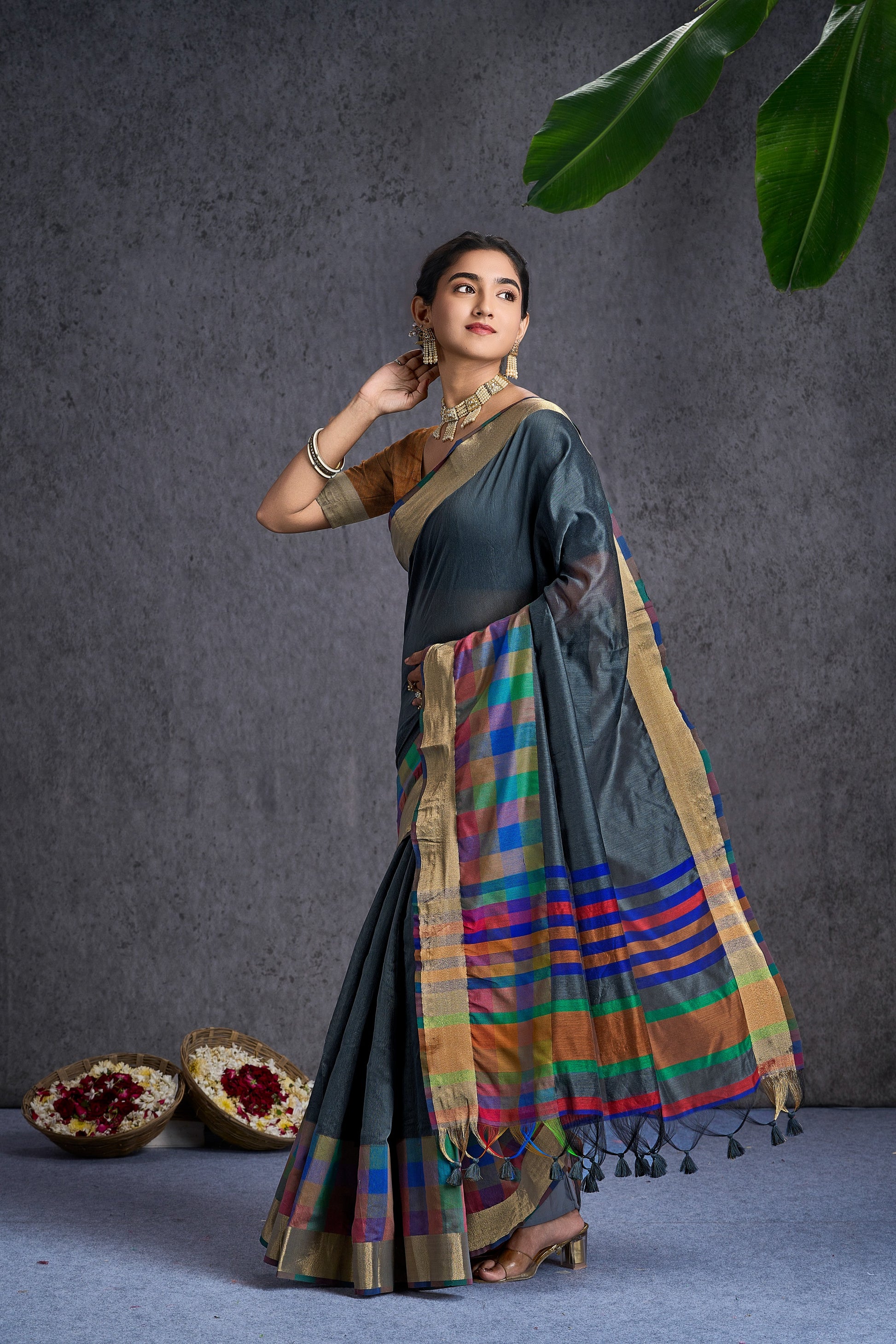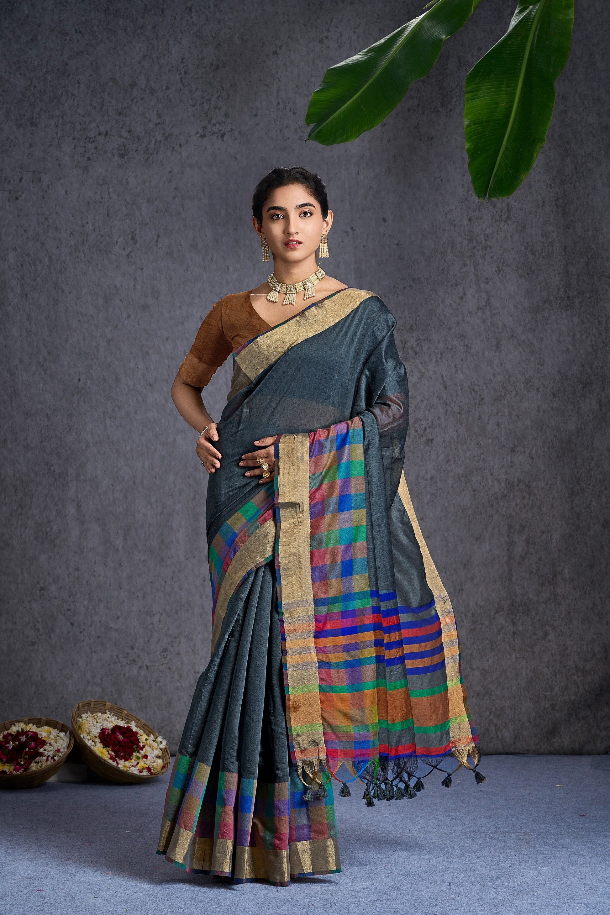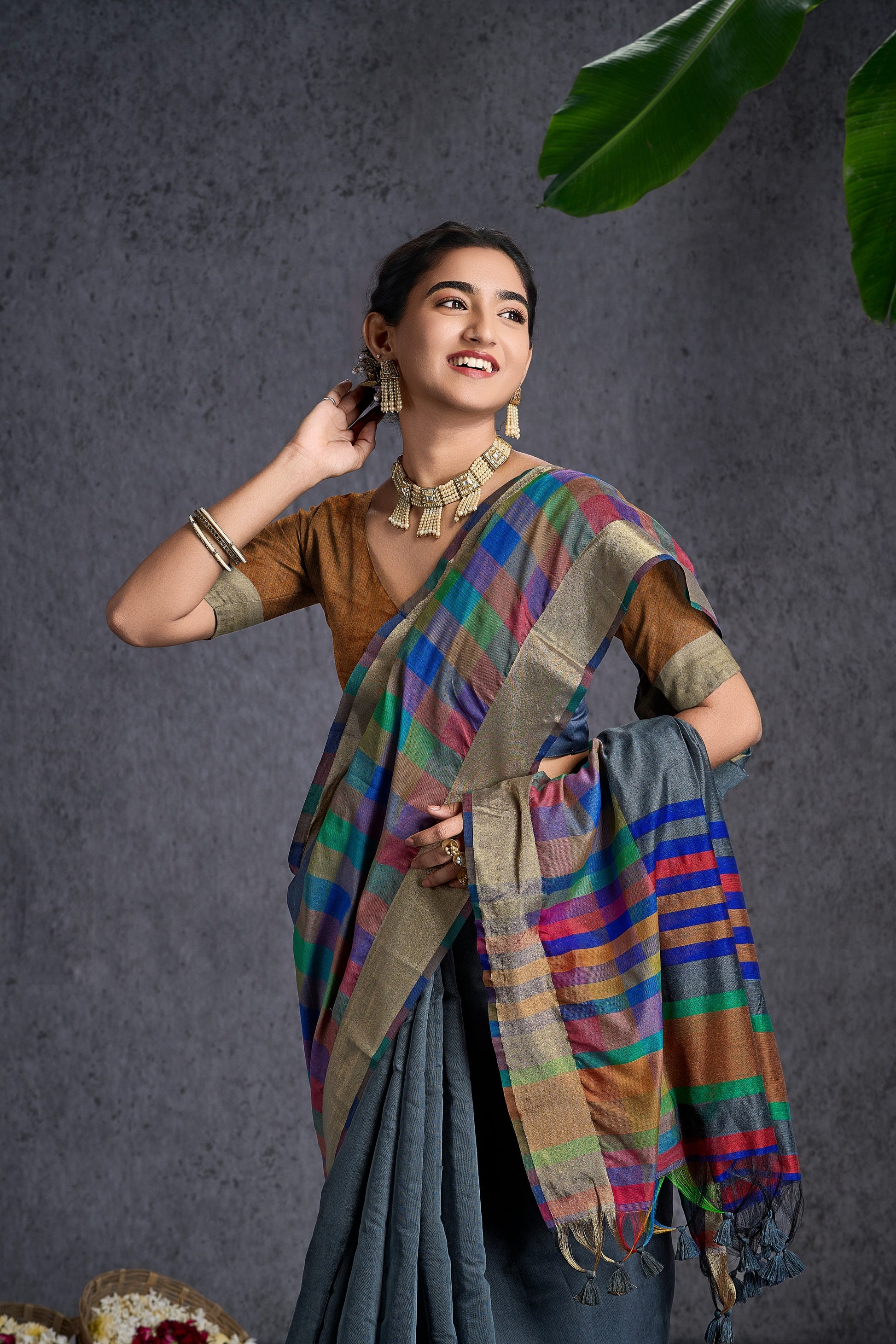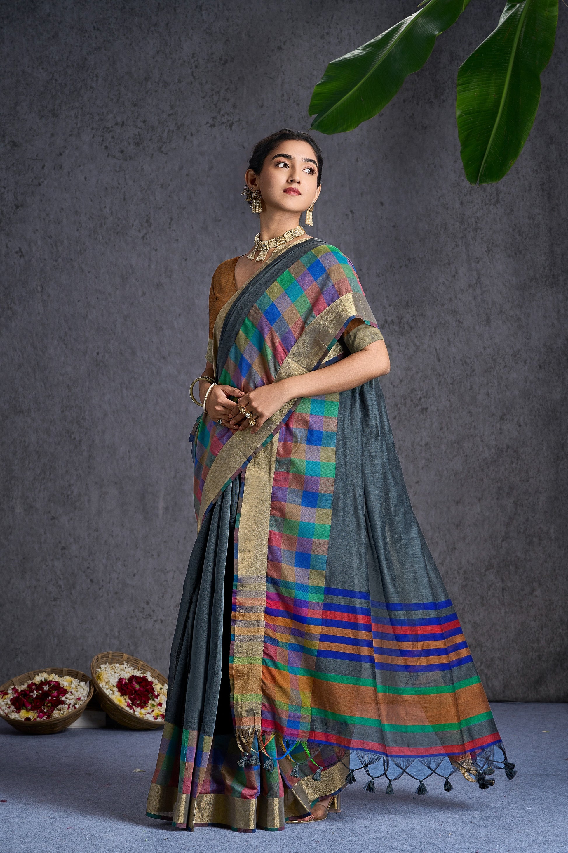 Vareeka | Grey Spun Polyester Chex Design Jacquard Woven Saree