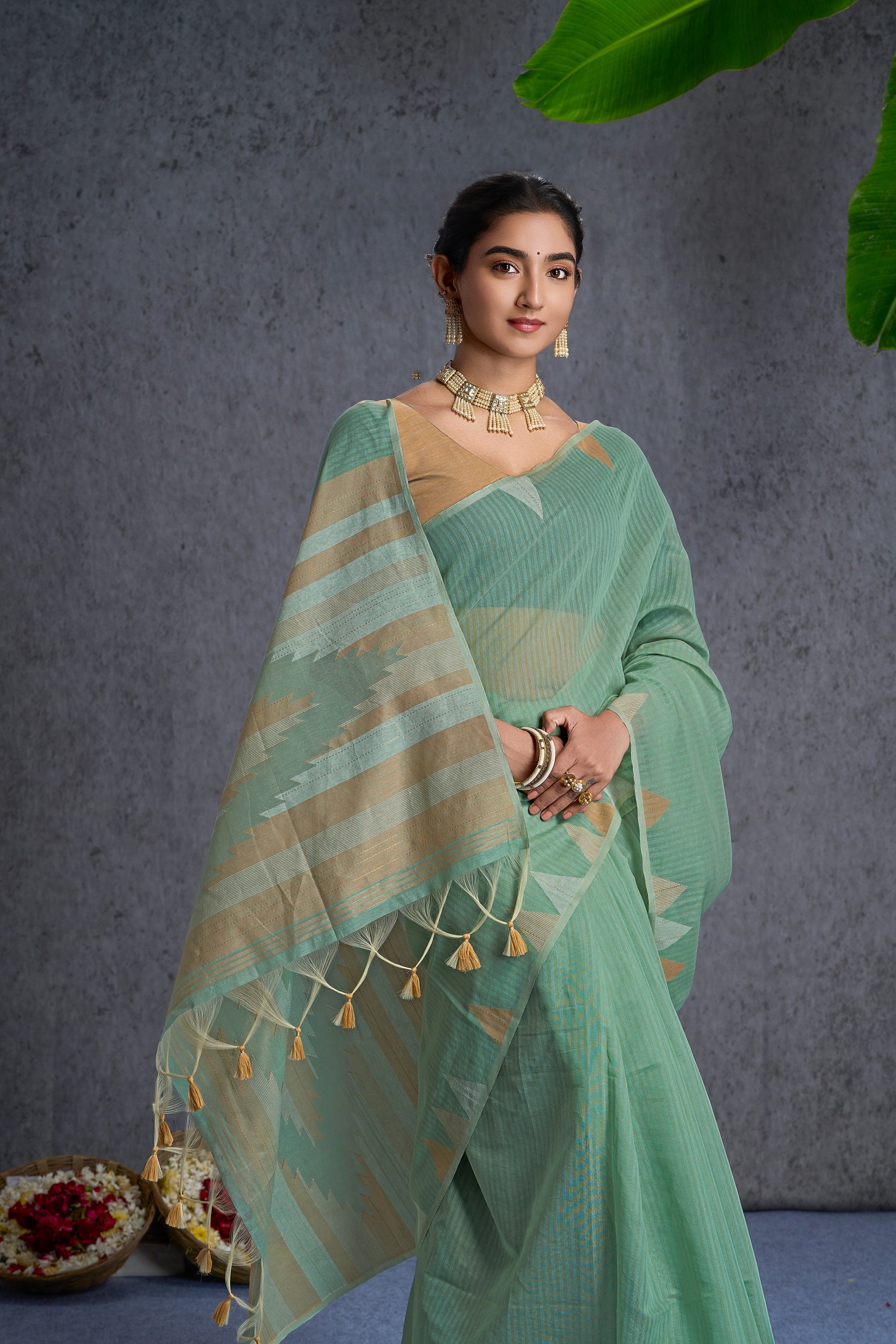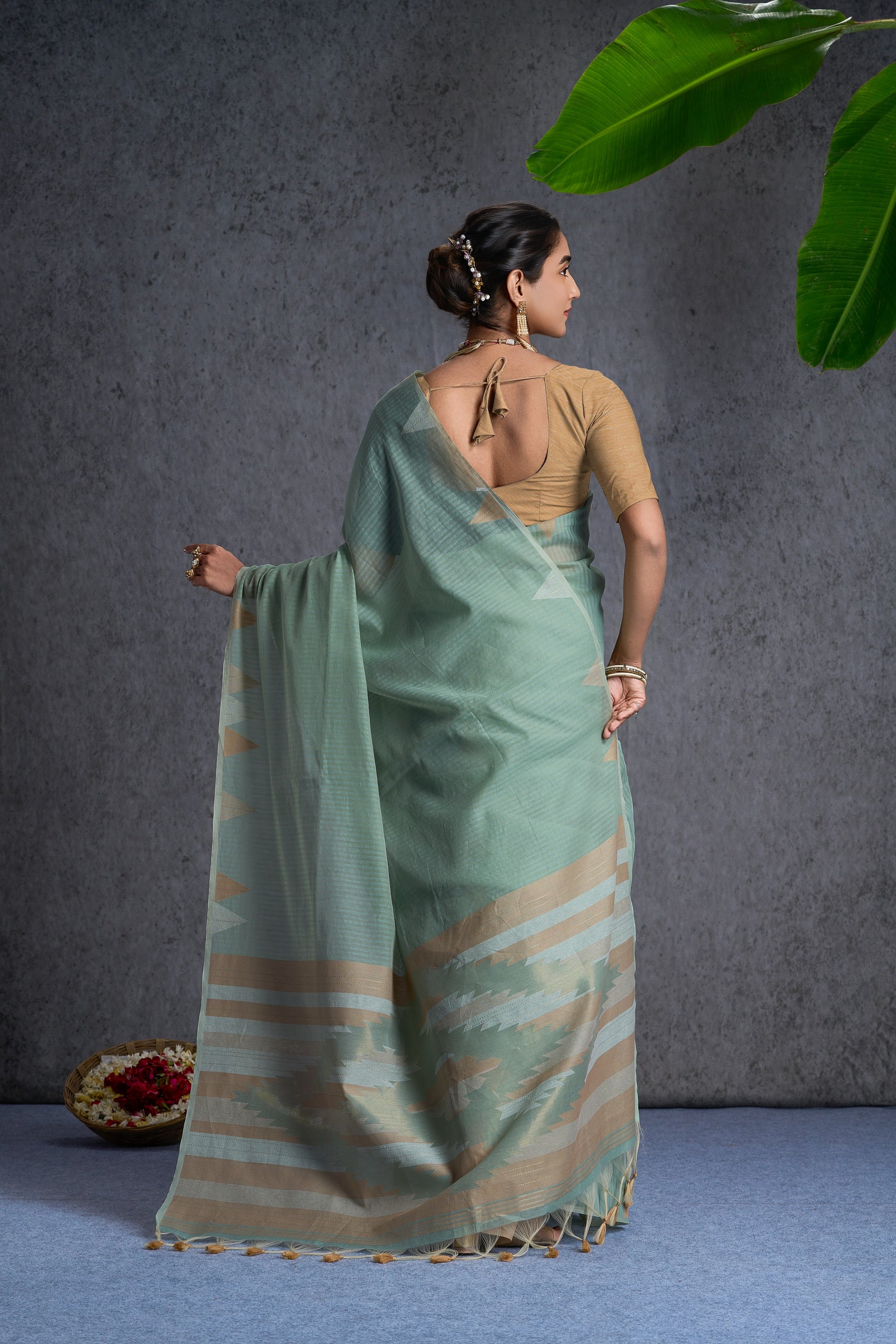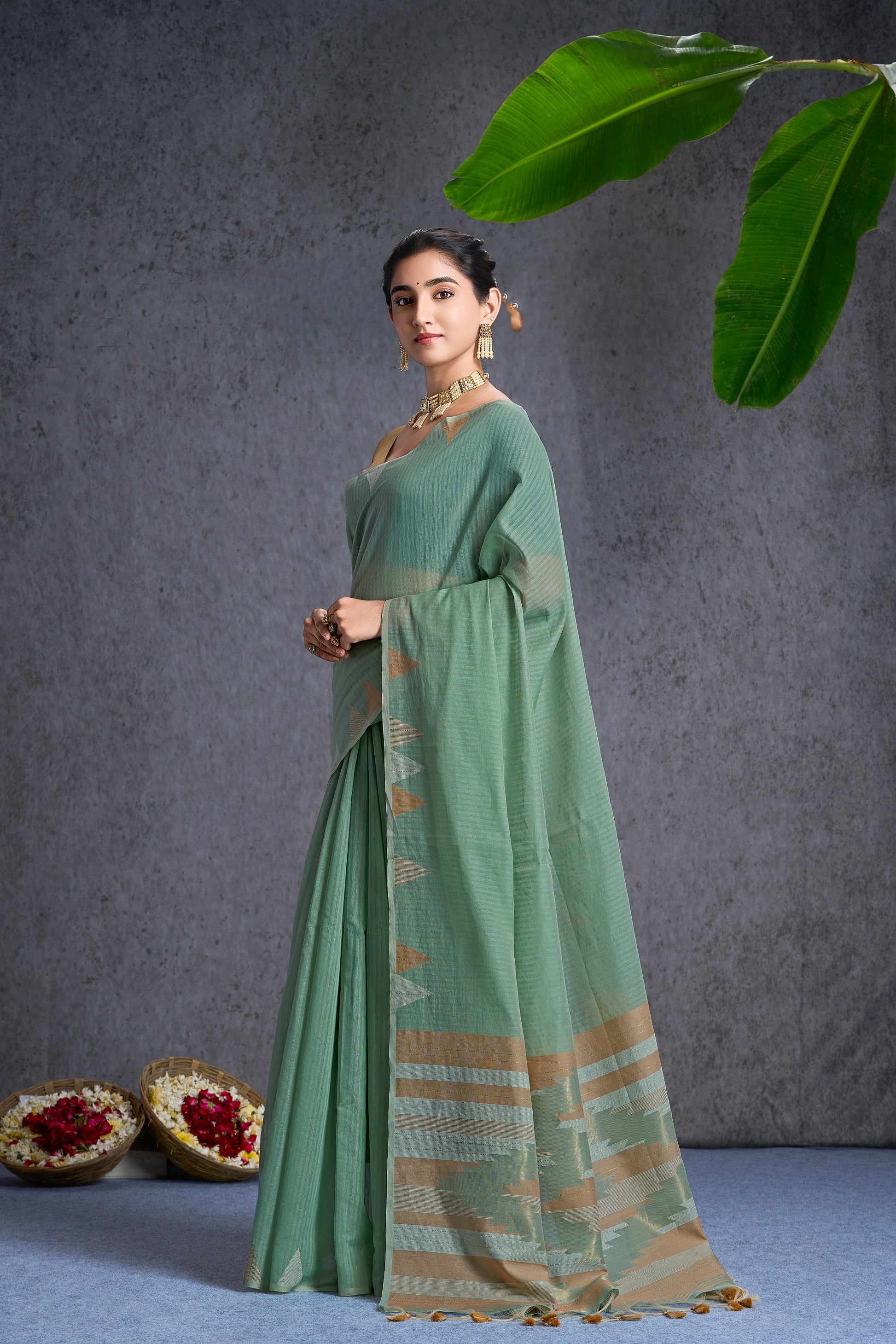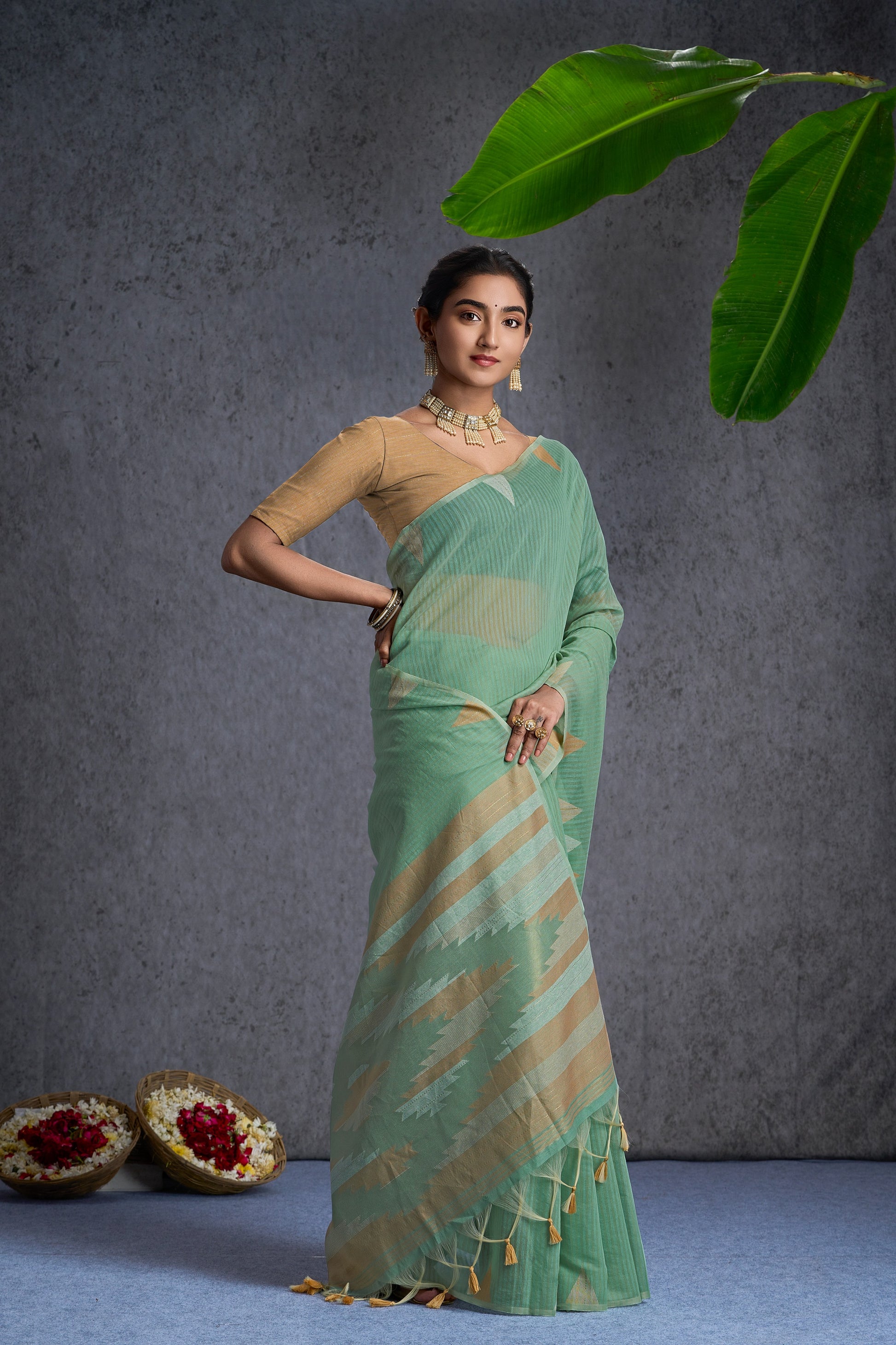 Dhakai Sparsh | Green Soft Cotton Mul Jamdani Design Jacquard Woven Saree.