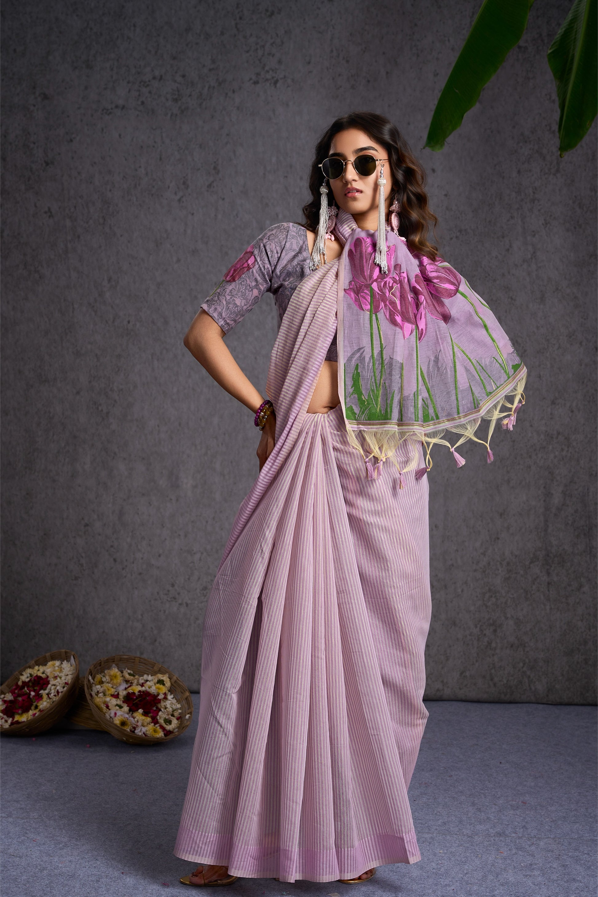 What truly elevates the design is the pallu, where a line of bold, artistic tulip motifs unfolds at the edge. The flowers are illustrated in a fluid style, adding a gentle contrast to the crispness of the striped body. The entire saree is crafted on a jacquard-woven base, giving the patterns a subtle texture and refined depth that feels elegant up close. The shading within each tulip adds a soft, almost hand-painted effect, creating a delicate play of light and depth, while still maintaining the precision of weaving. These tulips feel alive, bringing a quiet vibrancy to the drape and turning the pallu into a graceful statement that draws the eye without overwhelming the saree’s overall minimal charm.