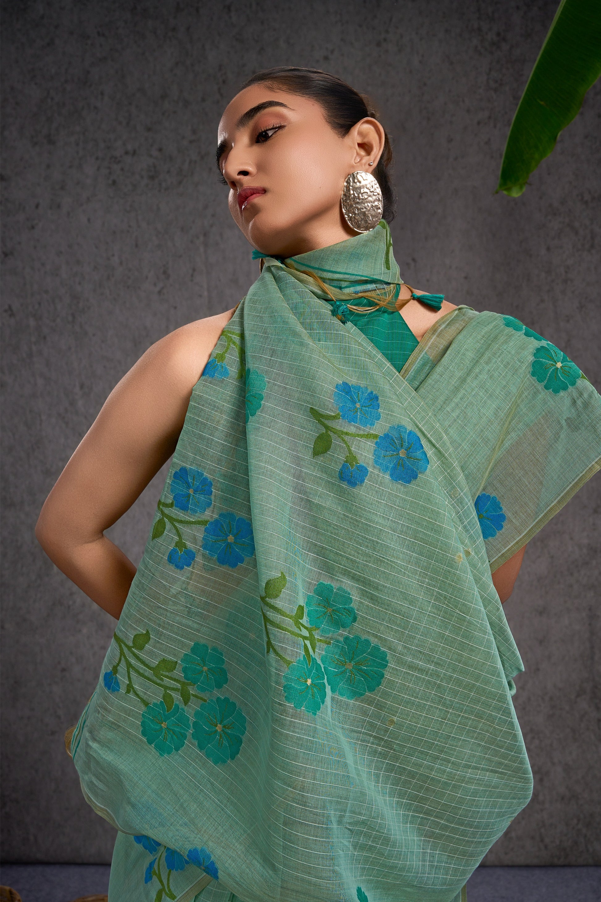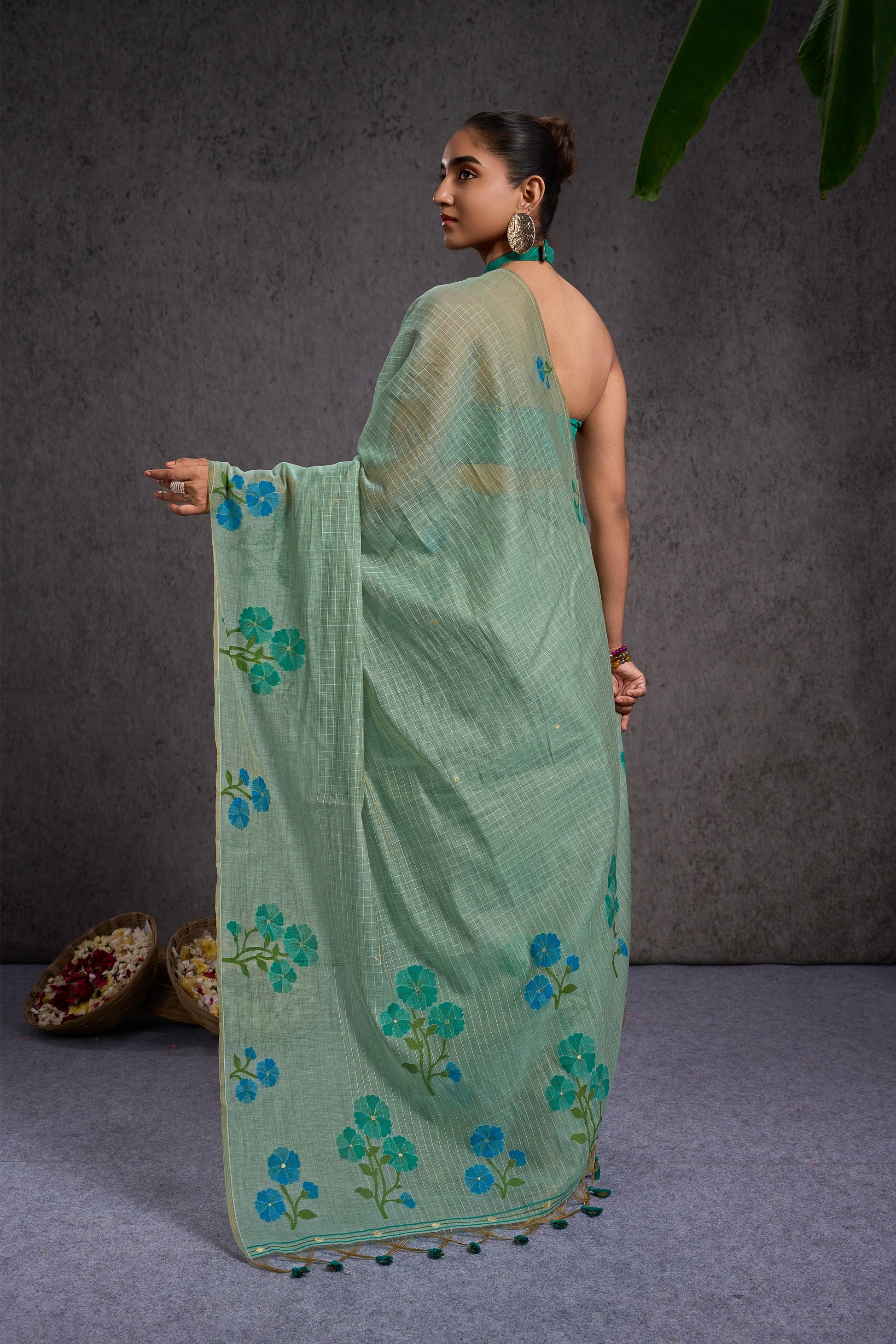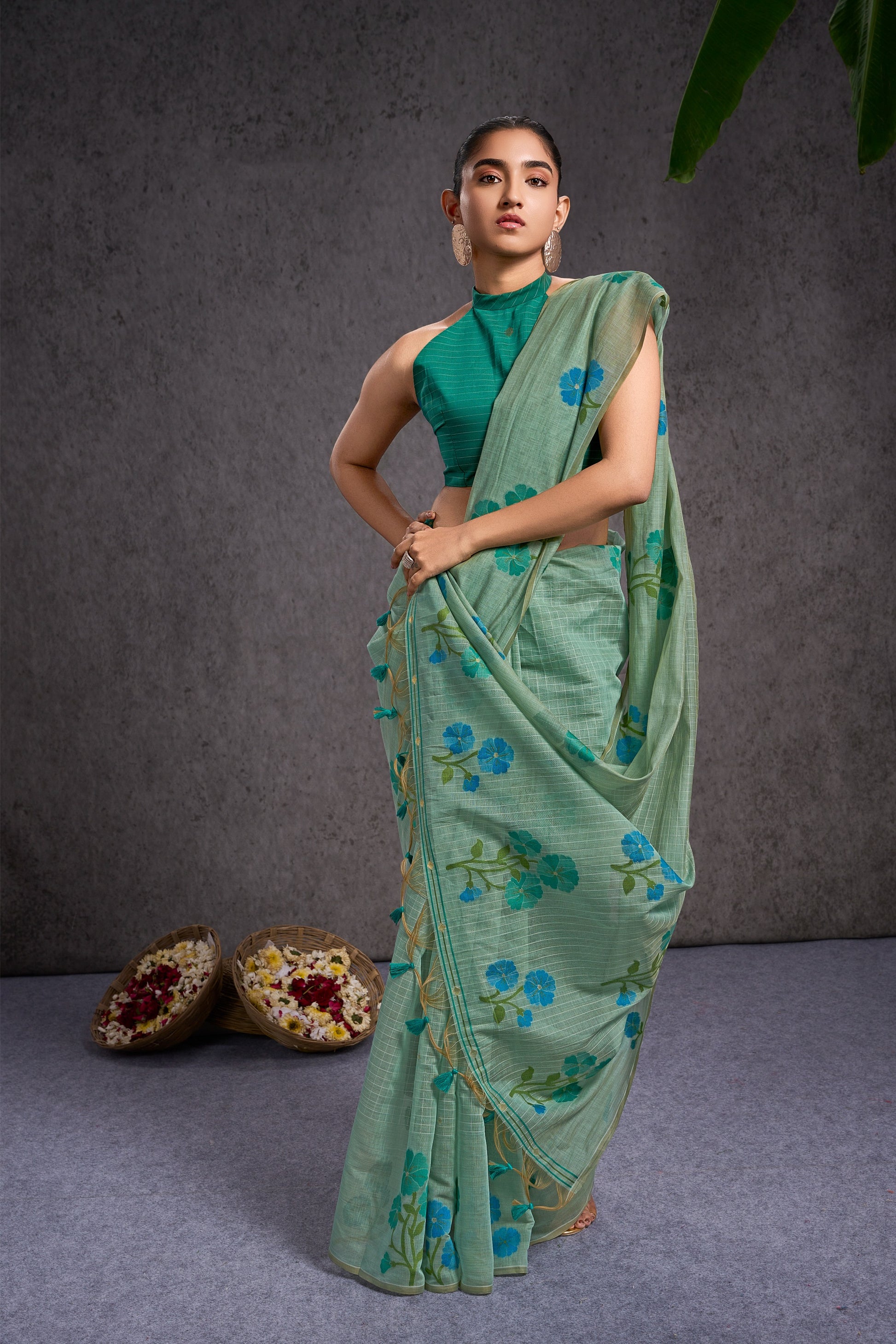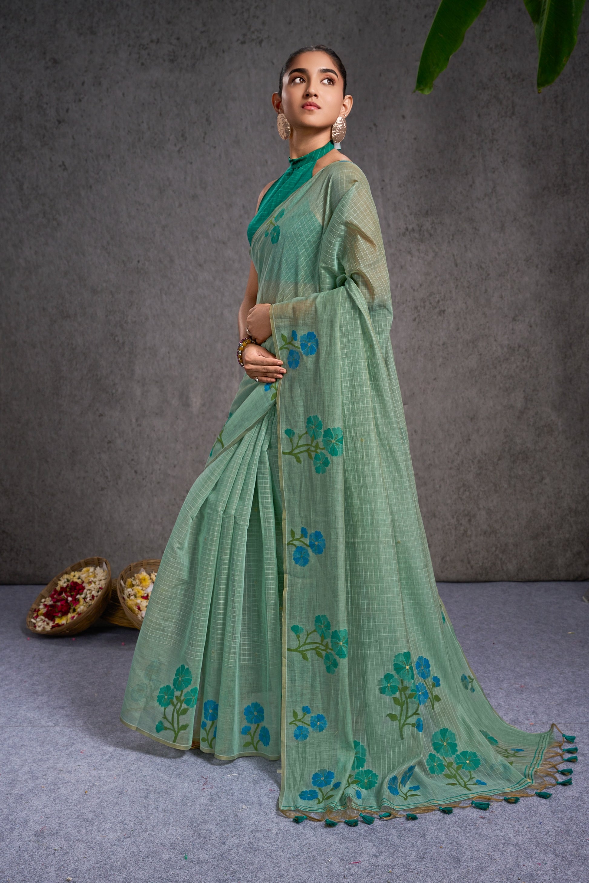 This fresh mint-green floral saree is perfect for everything from office days and brunch outings to poojas, family gatherings, and cultural events, light, elegant, and beautiful enough to make you feel effortlessly noticed wherever you go.