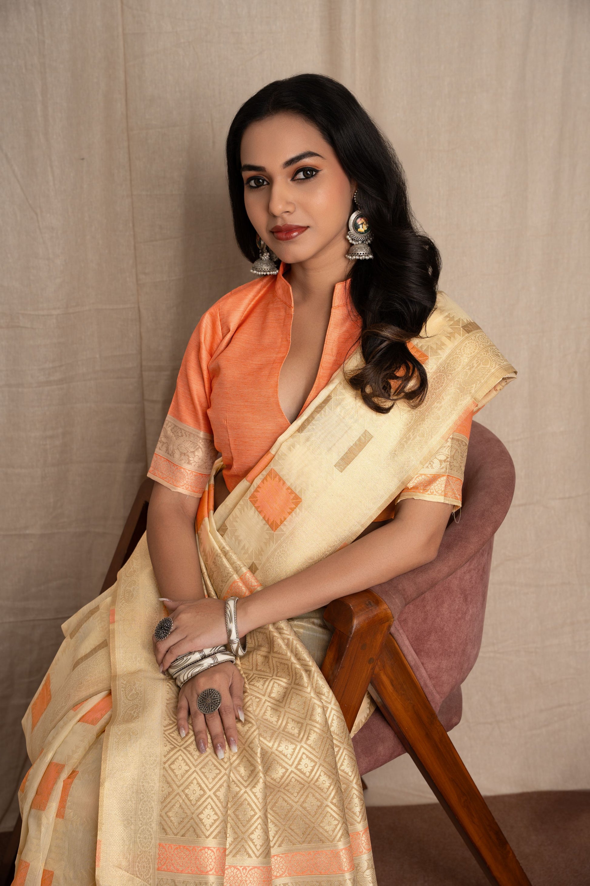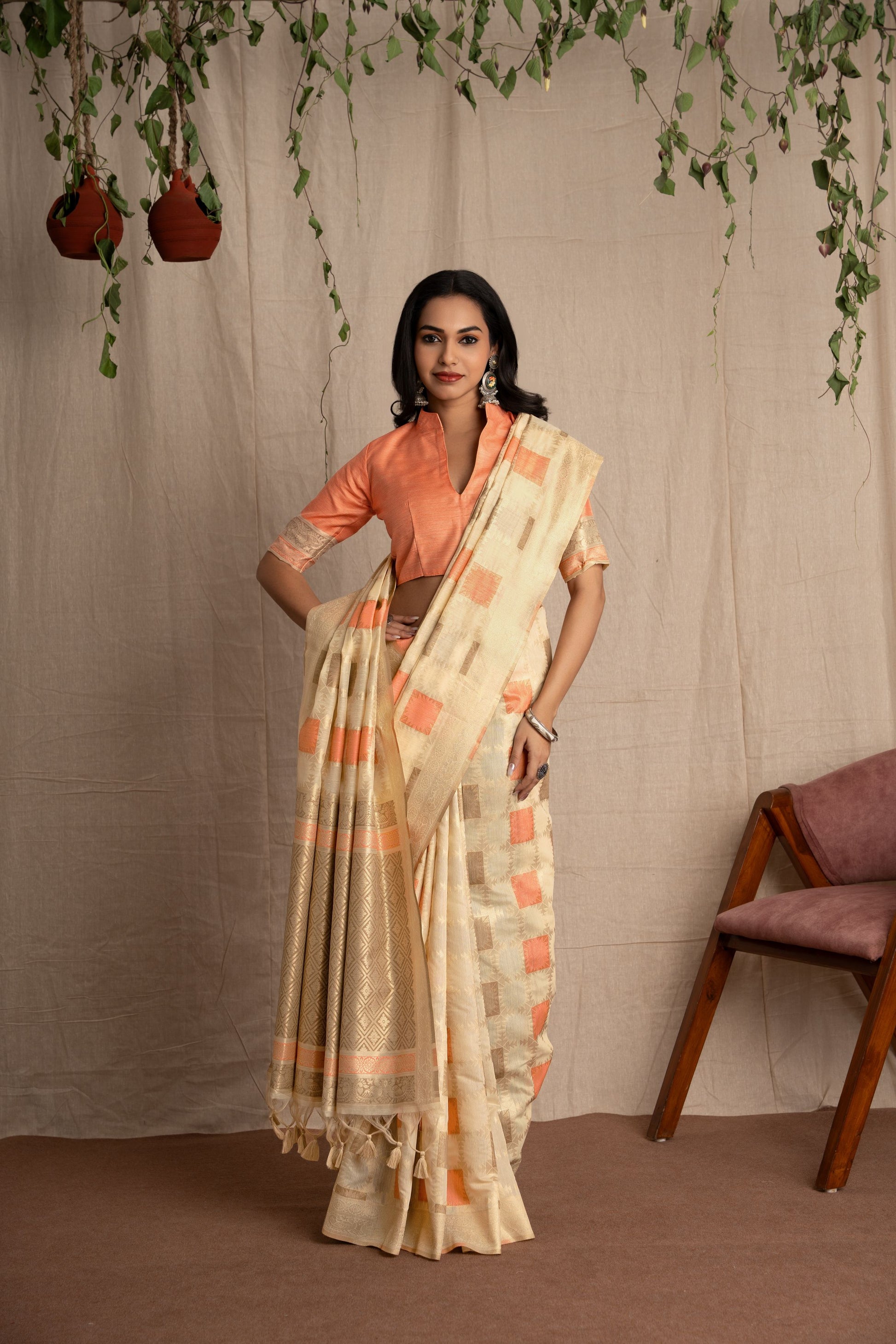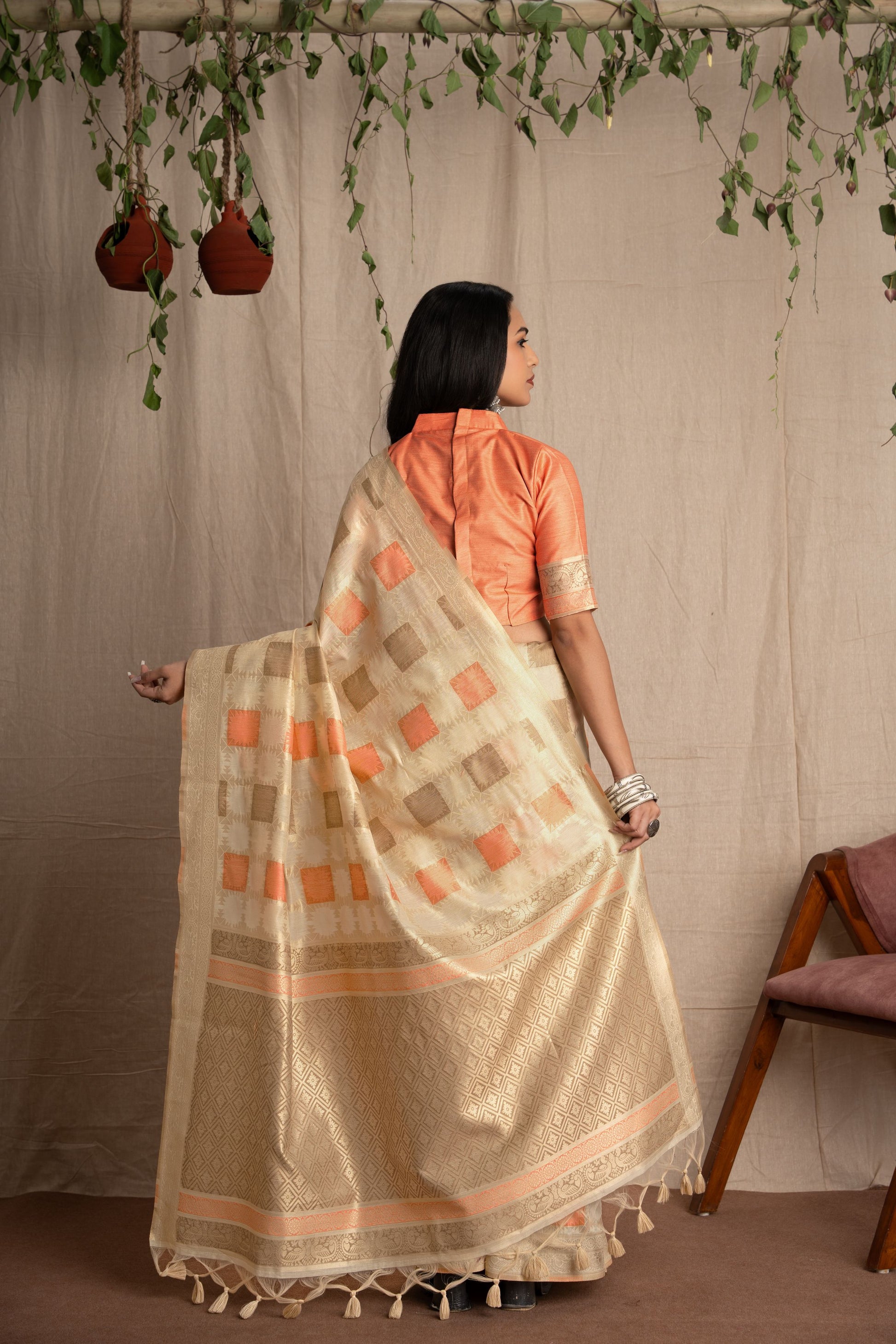 Subtle yet striking, this saree features exquisite Jacquard weaving with a contemporary geometric design. The complementing orange blouse adds a bold contrast, making this ensemble a perfect blend of tradition and modern aesthetics.